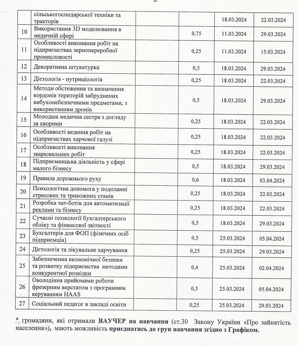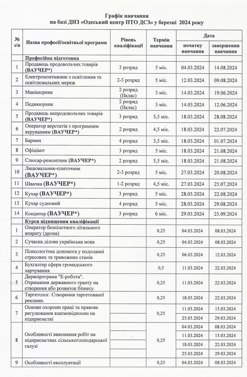 Графік навчання на базі ДНЗ «Одеський центр ПТО ДСЗ» у березні 2024 року